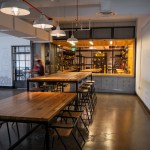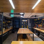 Reflecting Carhartt’s do-it-yourself ethos, the Tool Bench loaner service allows community members to choose from 150 different tools, free of charge, for use on DIY home and garden projects. Carhartt loans these tools for seven days at a time, and an on-site tool expert is available to help answer questions or offer demos. Slats of reclaimed wood wrap from the ceiling to the wall and the counter. In the well-organized storage area beyond, industrial-yellow tools pop on shelves set against dark gray pegboard. Coordinating long wood-slat worktables are available for demonstrations and workshops.