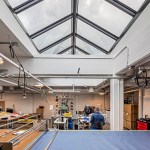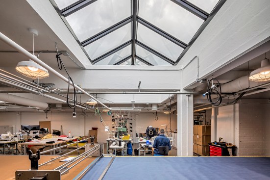 In addition to the Workshop, a third-floor parking garage was converted into manufacturing space. Currently home to ISAIC Detroit, a non-profit apparel manufacturing group with a social mission, the raw concrete shell was enclosed by new expanses of glazing and large skylights that illuminate workstations with plenty of natural light. Early in the COVID-19 pandemic, ISAIC used the space to manufacturer face masks for healthcare professionals and first responders.