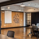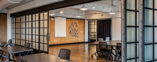 Carhartt Workshop’s two Community Rooms can be reserved for free by local organizations and small businesses to host a variety of meetings, training sessions, and workshops. Multi-media features that enhance meetings include a laser projector with HDMI capability, a network of Sonos One smart speakers with voice recognition, rolling carts equipped with 56-inch displays and computers, conference phones, whiteboards, and business-class Wi-Fi. Folding metal-framed doors with frosted glass allow the rooms to be partitioned off or flexed into one large space to accommodate large groups.
