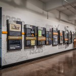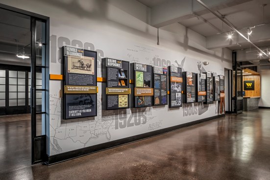 The second floor opens to a large flexible space available for use by local organizations. Included is a 26-foot-long visual timeline detailing Carhartt’s more than 130 years of workwear innovation. Separated by a curtain is the more intimate Detroit Lounge, furnished with an inviting plush sofa upholstered in denim blue as well as natural leather chairs—materials reflecting Carhartt’s rugged apparel offerings. On a feature wall in Carhartt’s corporate color hang framed clothing items. Custom-designed display tables also hold classic merchandise.