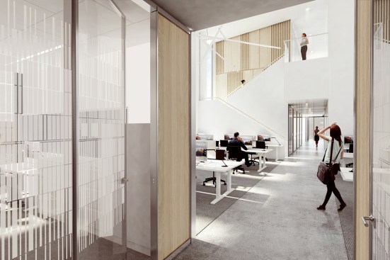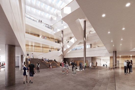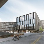 The building’s two entries are oriented towards the new plaza and pedestrian thoroughfare to the south, and towards the new transit hub to the north. The ground floor therefore becomes a new indoor gathering space on campus.