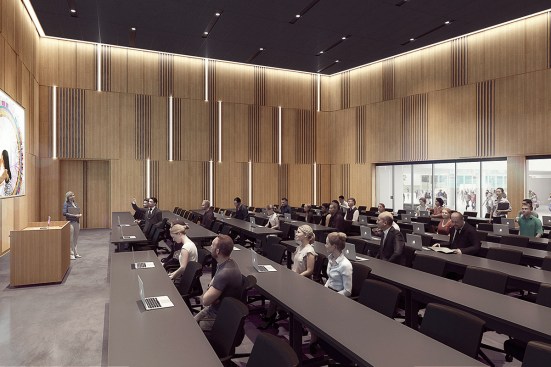 Classrooms are designed to accommodate different kinds of instruction: generous floor areas, height-adjustable furnishings, and audio-visual capacity allow for traditional front-facing lectures as well as group work and activated learning. The auditoria on the ground floor similarly accommodate for different types of pedagogy and program: the flat floor in the lecture hall allows for multiple use and seating configurations, while the tiered platforms and furniture in the auditorium can facilitate traditional lectures and group work simultaneously.