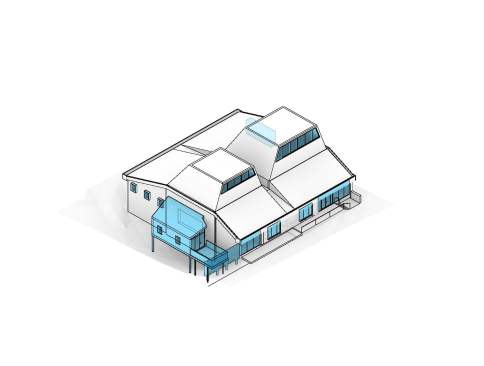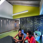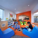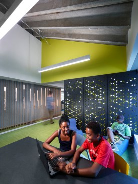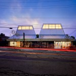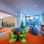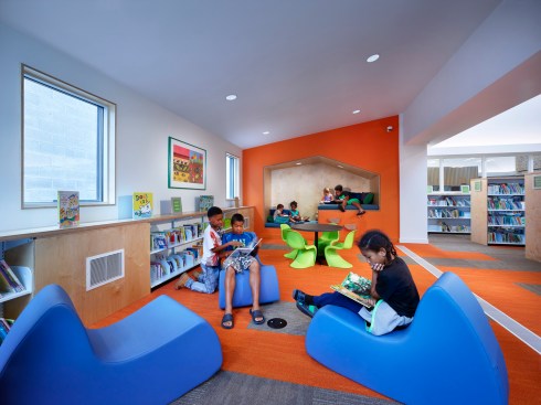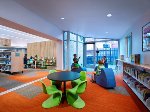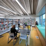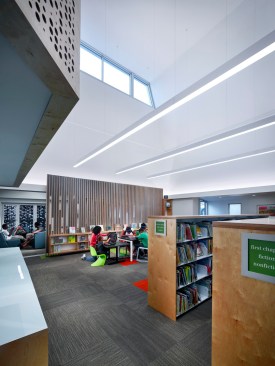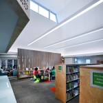 This renovation transforms a 1962 Brutalist concrete masonry building into a warm and inviting destination for a diverse, working class community. The new design now facilitates views to the street and brings daylight to the interior. The dramatic form of the building, including the two large roof monitors, was maintained while enhancing the interior spaces. Small daylight-filled additions at the front and the side of the original building maximize the interior plan, providing a dedicated area for teens and an expanded children’s area with an outdoor deck. The adult services area was enlarged and adds zones within the open space plan for computer use, casual reading, gathering, and quiet study, among other activities. Two meeting rooms at the lower level are available for library programs and community use. An interactive light display that animates the front façade at night doubles as an educational tool—patrons can control the display from a computer in the teen area.