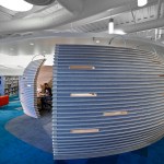 Located in a daylight-infused corner of the adult services space, the Teen Zone is intentionally divided into spaces that promote different levels of activity. The ‘living room’ is a very informal and casual space, facilitating hanging out, playing video games, and watching movies. The collaboration space, made up of small group seating, offers an environment for more structured and experimental group activity where the sharing of ideas occurs. Study group sessions and craft activities occur within this space. The Studio Hive, based loosely on the form of a beehive, provides the space for intensive personal creative exploration. It is insulated from more physical activity yet allows for subtle views into and out of it.