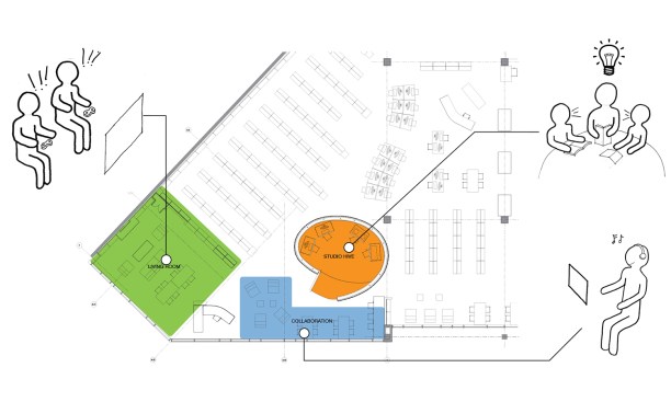 The Studio Hive is a part of the Teen Zone in the East Liberty Branch of the Carnegie Library of Pittsburgh. Recognizing that the teen population in this underserved community is in need of after-school educational programs, the Library targeted the building for a facility and program intervention. It was essential that capital costs were tightly maintained so that adequate funds could be allocated for robust programs centered around digital exploration and production.