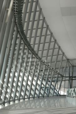 Inside the building, arrivals and departures are separated vertically: arrivals on the ground floor, and departures on the first floor, with vehicular access roads for passenger drop-off and pick-up servicing each level independently. An open atrium adjacent to the street entrance opens the ground floor to the monumental space of the main hall, visually and spatially linking the beginning and ending stages of a traveller’s journey. The roof provides a canopy over these access roads on the land-side of the building.