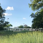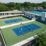 As a hybrid facility, the two-story clubhouse includes a pro shop, lounge and expansive locker rooms found in a typical high-end tennis club, above classrooms, meeting spaces and garden areas associated with a community center. The building and stadium courts are partially buried as a strategy to minimize the impact of a large structure in the park, to take advantage of natural geothermal heating and cooling of below ground surfaces, and to create a special precinct for both “tennis and learning.” Bleacher seats are not visible from outside the precinct, preserving the 127-acre recreational setting of natural parkland in New York City’s public Crotona Park. To address issues of durability and maintenance of standard tournament asphalt courts, the courts now sunken below-grade were constructed with post-tensioned concrete exceeding USTA construction standards. Courtside, the lower level of the clubhouse opens directly on to the exhibition courts, and parkside, the building appears as a low single story building.