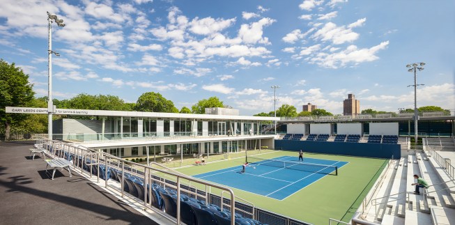 Conceptually, the venue is designed as a series of platforms—both for viewing tennis, from beginner to professional level, and metaphorically a platform to encourage afterschool learning—a project to create the opportunity for underserved kids to experience success on the tennis court as well as in life.
