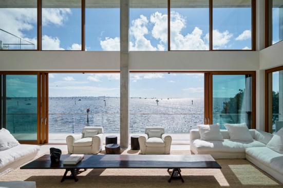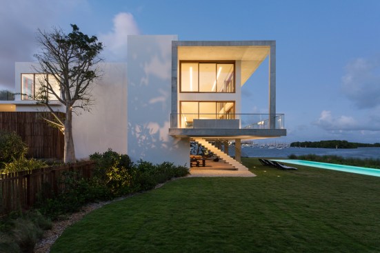 Nature and contemporary architecture coexist in this modernist structure that appears to float above water and lush greenery. Demarcations between outside and inside are purposefully blurred, encouraging a connection with nature even in the smallest of everyday gestures.
