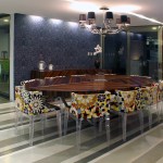 The floors and walls are in an uninterrupted dialogue through all the space. The dynamism of the lines and the color and texture accents result in an ambiance that describes entirely its inhabitants. The selection of furniture and accessories was also done very carefully combining retail furniture with specially design and produced pieces to match the activities and rooms.