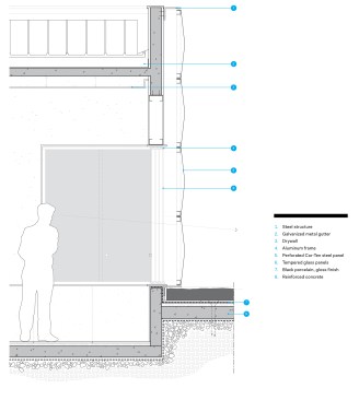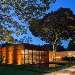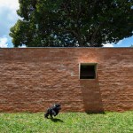 “We normally use natural materials in our work—ones that will get old in a good way,” Costa says. To that end, his team clad the all-important library in Cor-Ten steel panels, which lend a quilted texture to the rectilinear volume at the front of the site. The panels are 60 percent perforated to admit daylight while filtering glare that could fade the books.