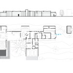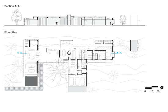 The house is organized with public spaces toward the street. An L-shaped path leads visitors around the side of the library to a courtyard behind. Instead of being greeted by a traditional front door, visitors can walk directly into the living room via a sliding wall of glass. An open kitchen and dining area round out the public space, where the client regularly entertains. The rear of the house has three bedrooms with en suite baths and an entertainment room for the family, all organized around a second, more private courtyard.