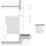 With the exception of the library volume, the house is built from pink-toned bricks, custom-designed and manufactured to measure 35 centimeters long by 6 centimeters high and deep. Unusually, the clay was not baked, but pressed in a hydraulic machine and dried. Each brick had a waterproof coating applied to account for the resultingly higher-than-standard porosity of the material. Masons arranged the bricks in a loose running-bond pattern to give the walls texture, complementing the waxed board-formed finish of the concrete-slab roof.