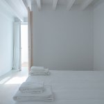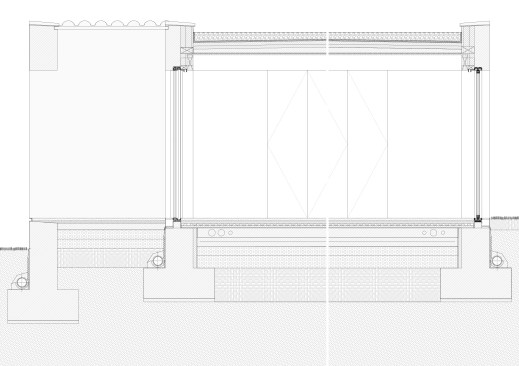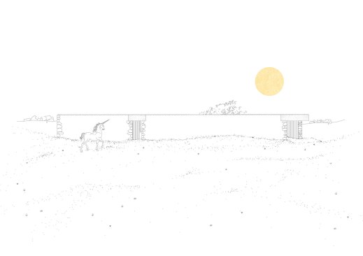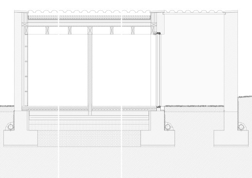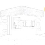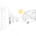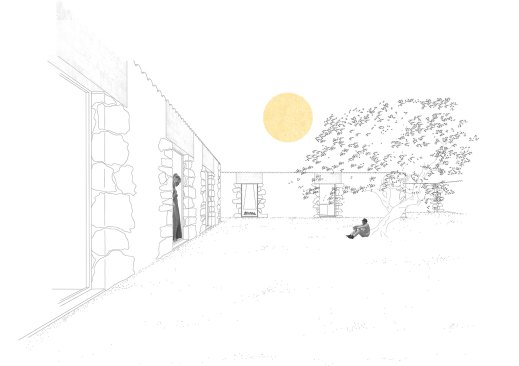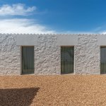 Clad from the outside in a whitewashed stone masonry, the thick walls are capped by an elusive pan tile, suggestive of a pitched roof that in fact does not exist, and an equally calk painted concrete lintel. The roughness of these burnt lime surfaces summons a vernacular and quasi-archaic condition which is nonetheless dismissed by its sheer scale and abstraction.