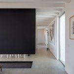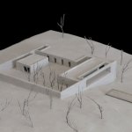 Inside the courtyard, three rectangular volumes occupy the North, the East and the West corners, comprising respectively the bedroom suites, the living room and kitchen and the garage-cum-staff bedroom, while the void southwards is formally occupied by an orchard. The common areas function in a classical sequence of unfolding rooms, from the kitchen to the living room and to the library, all of which are separated by symmetrical pocket doors. The dining area is divided from the living room by a large fireplace with a hanging metal chimney. The ceiling is made of structural whitewashed wood beams and boarding with white stuccoed walls and cement floors.