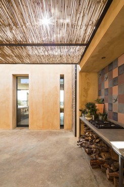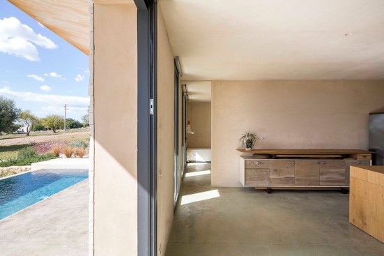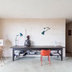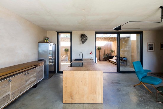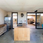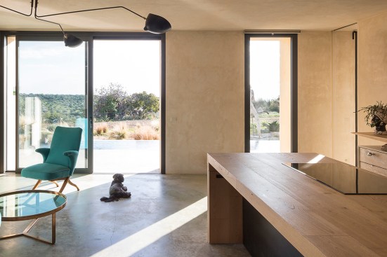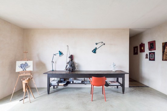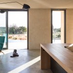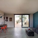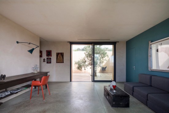 The inner spaces of the house respect accurately the geometric pattern of the external face: the living room and the laboratory face the courtyards in the north side and the sea in the south side. This choice gives the perception that the landscape crosses the inner space of the house.