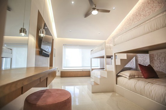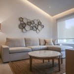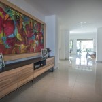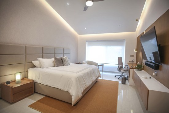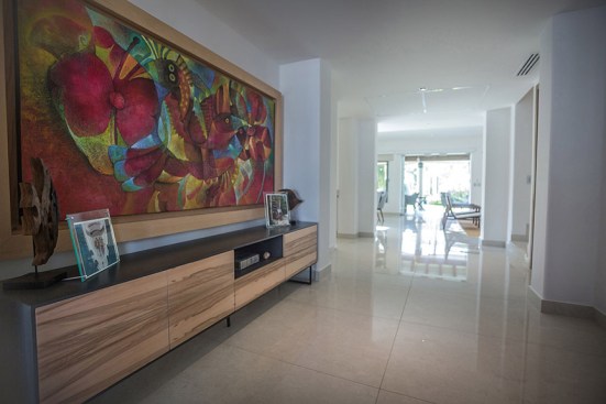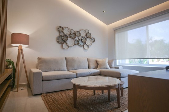 Plenty of light and tranquility were also two of the client´s requests, considering that it is a residence to enjoy life close to the sea, the materials selection was done aiming to emphasize these two elements through ivory ceramic floors, walnut wood in hazelnut shade, and a combination of wallpaper and white paint for the walls.