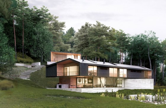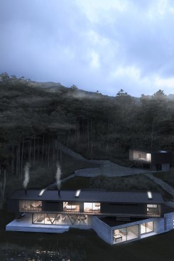 Located in the upper area of Avándaro, Estado de México, the land shelters the course of a river and has a plan for the distribution and use of water, wetlands, planting areas, fruit trees and harvest gardens. A family vacation home is incorporated into this scenario, through a comprehensive creative exercise focused on responding to all functional requirements and giving value to the joint in its completeness. The shape of the main house arises from the geometry of simple volumes. Composed by two prisms, one above the other, a third volume is formed between them, a void prism. The composition evokes typical construction forms found in Valle de Bravo, such as the cabin with a gabled roof, that proposes a reinterpretation of this iconography with a contemporary aesthetic and more complex functionality. The upper volume encloses the family’s private spaces, while the lower volume contains the semi-private ones, such as the guestrooms. The public or shared spaces are located in the void generated by the intersection of both volumes described, which are open and permeable to allow a connection with the exterior. The project incorporates bioclimatic design and technologies to take advantage of the environment’s natural resources and regulate the different conditions that can affect habitability and comfort, such as humidity and temperature. Observing and understanding the role of each element present in the intervention space, as well as paying attention to the context’s precepts, were the strategies that gave rise to the whole project.