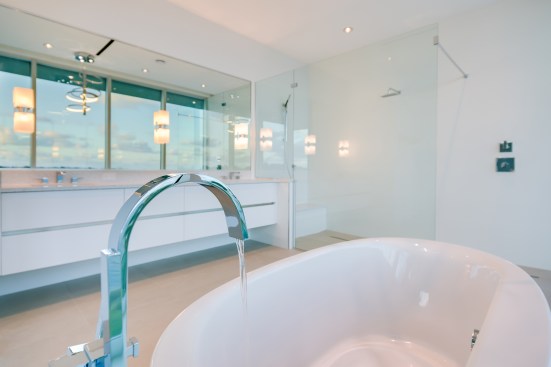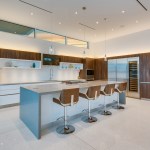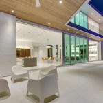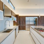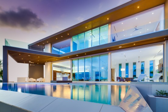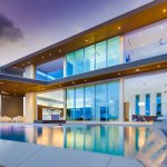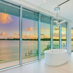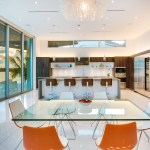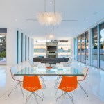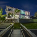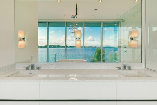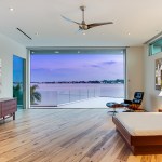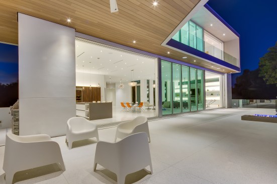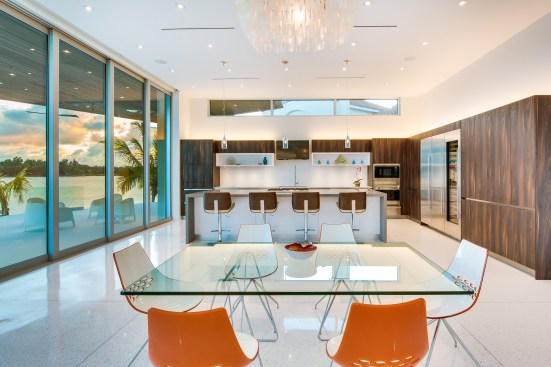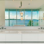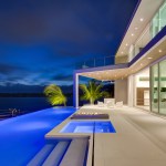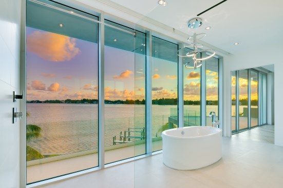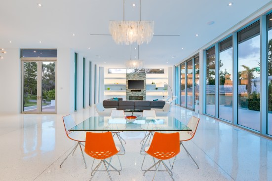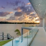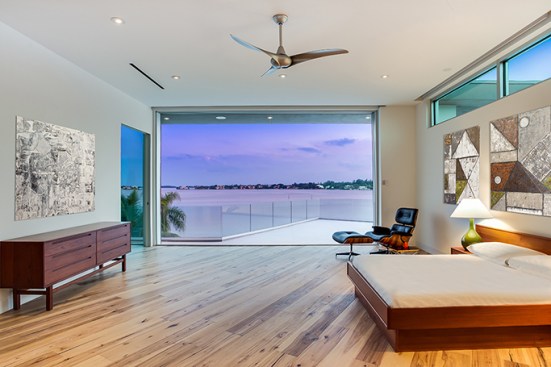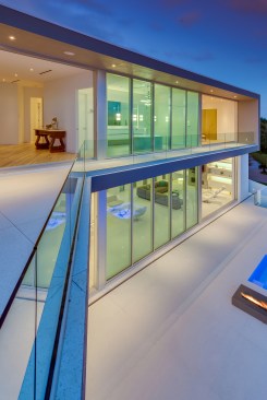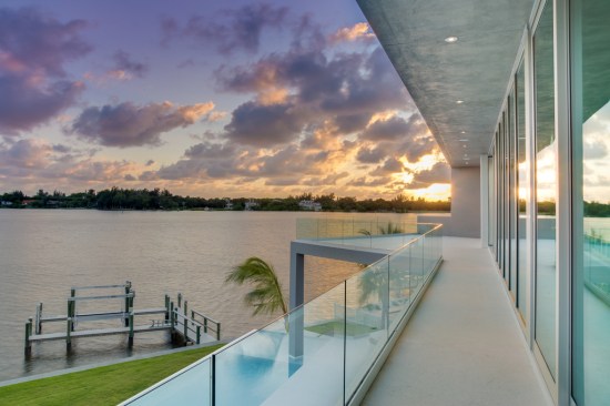 The spectral light of Florida's inter-coastal waterway is gently articulated on the exterior frame of this unique residence and elegantly integrated with the rotated floor plan. The south west water front elevation's fifty five foot long expansive glass sliding doors, designed under intense hurricane code restrictions disappear when opened. The house opens to the sleek elevated three sided vanishing edge pool, respecting the incredible water vistas and limit the sightlines to the neighboring residences.