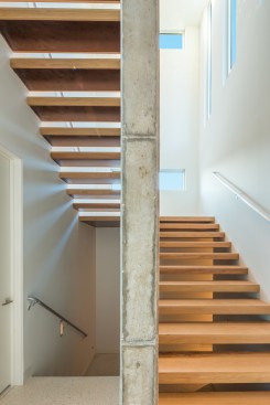 A projected frame concept was developed to frame the rear façade and shelter it from the south west sun. This frame becomes a covered balcony on the first floor and extends out towards the water to become a sun deck on the second floor and anchors the back of the house by returning to grade.