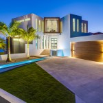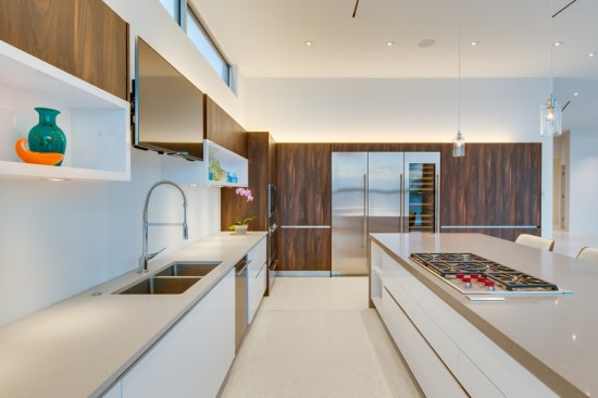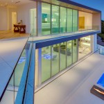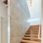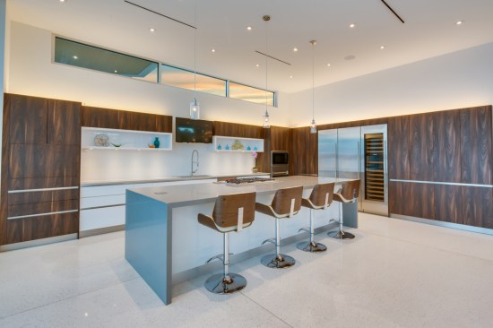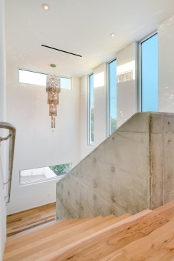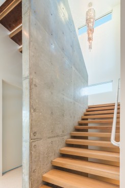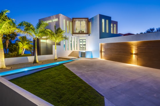 The front of the residence showcases a linear water feature lined motor court that leads to the main entrance. The entry sequence has visitors walk over this water feature via a glass bridge. The light passes through the bridge and cast dramatic shadows and reflections onto the home. The wood clad – four car garage reads as a singular component extending from the angular two story elevation, complementing the cantilevered box frame room which shelters the front door.