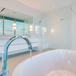 The first floor living area is an expansive open plan with the kitchen anchoring the great room to the dining room, sitting area and a casual living room which are all open to the outdoor living space by walls of movable glass doors. The second floor also captures the water vistas with large panels of sliding doors that open the bedrooms to the outdoors.