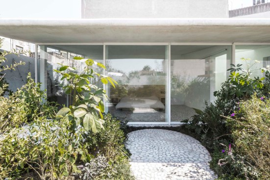 All new additions are realized in white marble concrete to achieve a contemporary environment with a fresh character. Besides the new roof the entire flooring is realized from cut marble pebbles in direct reference to Mexico City's lost river beds and lakes that used to form the landscape before the city was established. Furthermore an in-situ concrete bench and table were cast into a niche within the garden. A new spiral stair connects the art deco lower floors with the contemporary garden level letting daylight pass down from roof lights above the stairs. Spaces within the existing structure were joined and revamped with new window openings, wooden flooring, a new fire place, built-in furniture and brass lamps specifically designed for the project.