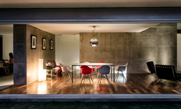 The constructive system applied is based on polystyrene panel walls covered by cast-in-place concrete plates, giving pleasing thermal and acoustic conditions without the use of climate comfort mechanized systems, conforming its materiality with natural exposed elements as wood and marble.