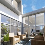 Constructed of low or no maintenance materials, manageable and usable gardens, and ease of access for both residents and visitors. The houses define the autocourt, but also embrace private outdoor rooms that extend adjacent interior spaces. These private indoor/outdoor spaces are protected by a permeable, woven patterned brick wall which provide privacy and well as ventilation for these spaces. This allows for expanses of picture windows and doors and free flowing open plans.