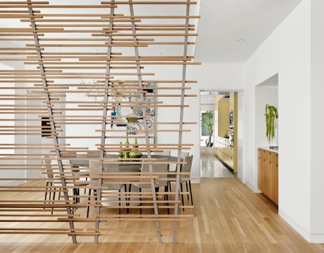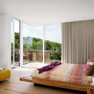 Sited perpendicular to the site’s slope, the house extends deep into the property defining a cultivated courtyard uphill while the rest of the property remains in its original state. The view from the public rooms looks south into this private oasis and up into the tree canopy. Accessed by a glass bridge, private rooms frame views north into the picturesque, unadulterated site.