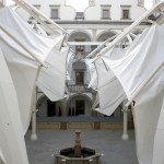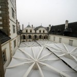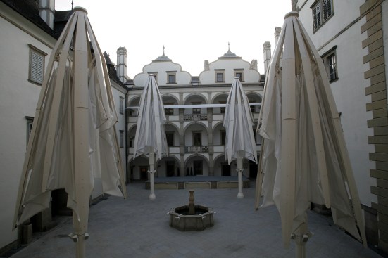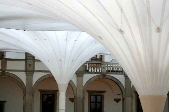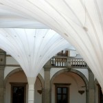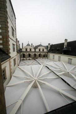TENARA Fabric 4T40HF in the form of four 15m x15m all-weather, inverted-style umbrellas gives the castle flexibility and function in its rectangular Renaissance-style courtyard. The umbrellas elegantly open and close – the attached fabric folding and flexing along with them.