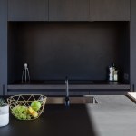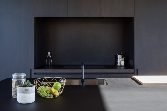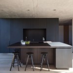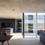 The building materials, have been guided by the vibrant colours of the rural landscape. Grey wood, patterned concrete and dark, anodised windows are the main components. The use of concrete is a wink to the historical nature of the surroundings and accentuates the massiveness of the building. Oak floors provide warmth to the interior and the kitchen area made of black-stained oak acts as a resting point. These basic colours make sure the focus is on what is happening outside, not inside.
