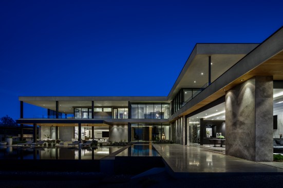 Protected natural daylight is important to the entire program and is maximized through strategic locations of glass and covered canopies. The desert sun is harsh and oppressive, but when protected with shade and natural ventilation (through passive cooling and heating), one can live quite comfortably within the desert. Cayambe’s rectilinear forms and canopies extend through the sky, stretching ones view beyond to the elongated mountain range. The thermally treated expansive glass and outdoor sitting areas are protected from the sun with large overhangs (and trellis structures) that create shade and unique shadow vignettes that accentuate the site and architecture of the home.