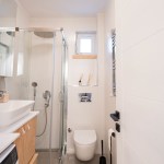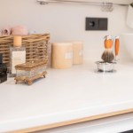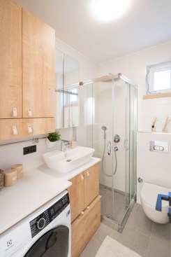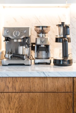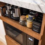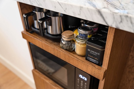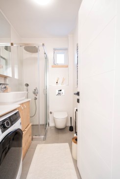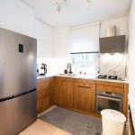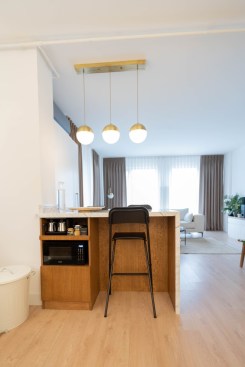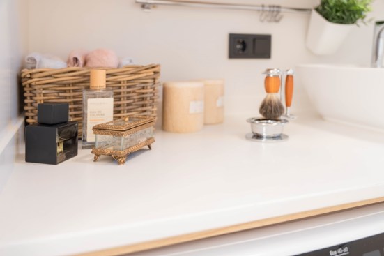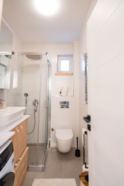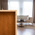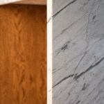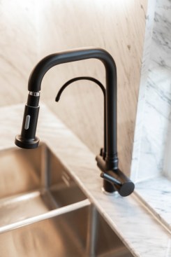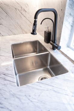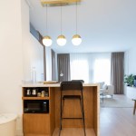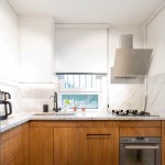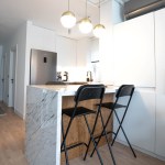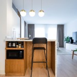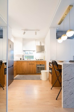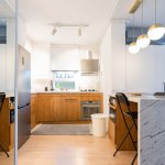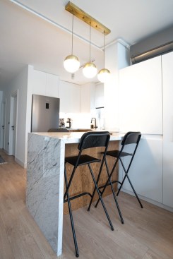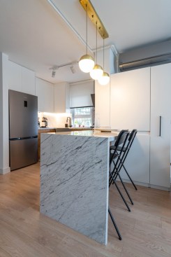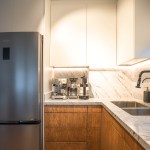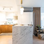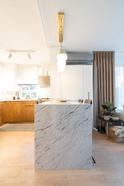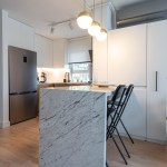 The kitchen was a separate area with the living room. The wall between the living room and the kitchen has been removed. In the old design, dinner table wasn’t able to use without moving it. The wall thickness was integrated into the design to make it more stable and useful and the dining table was solved by taking 25 centimeter from kitchen and 45 centimeter from living room. To use even five centimeter is important for narrow places and as we know this rule we tried to use all opportunities. The kitchen countertop is Carrera Marble and all the counter top folding style designed to the wall and counter top of dinner/bar table folded and waterfall design reached to floor.