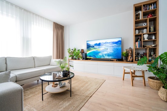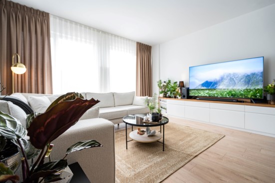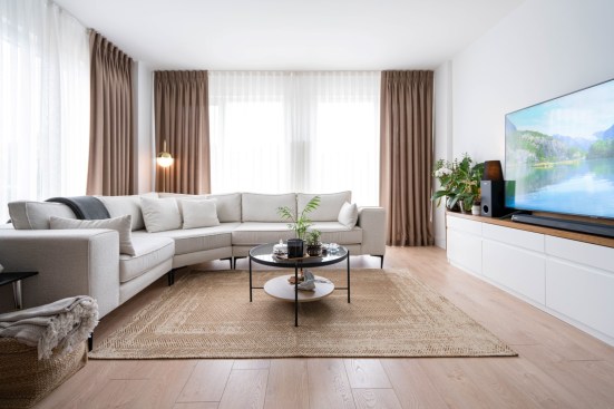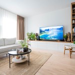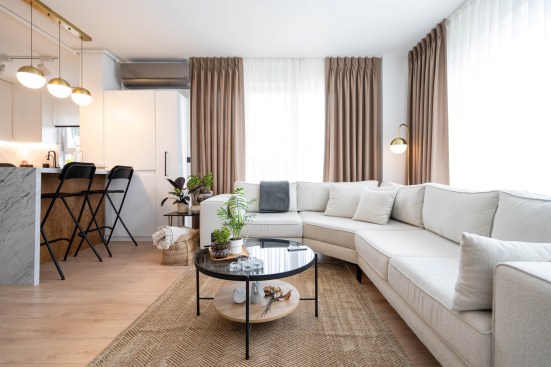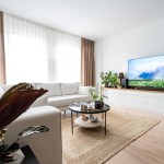 In the old design, the curtain cornices was covered. In the new design, the whole area was opened and the cornices were made visible. By doing that, extra height added to the living room. Thus, the space became higher and brighter with white walls and ceilings.