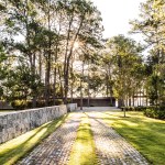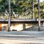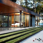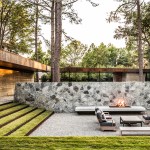 Another structure to the west contains a guest suite and storage flanked by a covered porch and a carport, lined on two sides by a bocce ball court and an existing tennis court. A storage barn, also designed by the firm, sits beyond. Wernerfield worked with Dallas landscape architecture studio Hocker Design Group from the start, developing the site’s layout, the relationship between the buildings and the trees, and the guiding geometries of the stone wall and wings of the main house. “It was a very holistic process,” Werner says.