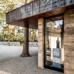 The house had to sit amidst the trees. The client helped plant the now 40-foot-tall pines on this family property as a child, and the new buildings he commissioned for this wooded lakeside site needed to nestle among them as unobtrusively as possible.