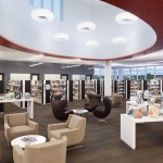 From the exterior, the activity of the library is prominently on display through large expanses of floor-to-ceiling glass that wrap around the building, visually connecting patrons and pedestrians. On the interior, the design maximizes flexibility and leverages new mobile and RFID technologies to meet the rapidly changing needs of the 21st Century library. In the words of the library director, the new library needed to function “more like an Apple Store and less like the DMV.” Guided by that statement, the design team removed dense book stacks, the traditional circulation desk, and the security systems at the door. In their stead are lower height shelves that preserve views across the building and welcoming staff kiosks strategically placed throughout the collection space.