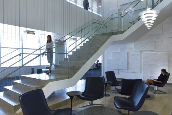 The LEED Gold design features materials that are environmentally friendly and energy-saving while also allowing for light and an enhanced sense of openness.