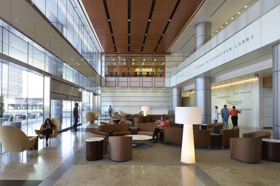 The flexible building houses translational research labs as well as outpatient centers of excellence, clinical functions and outpatient procedure centers. A plaza level features an educational center, café, pharmacy, blood lab and imaging facilities.