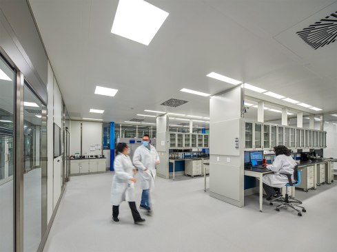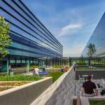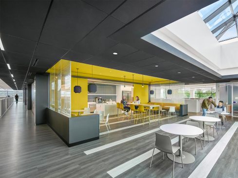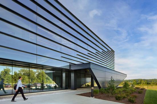 Kite Pharma is a pioneer in cell and gene therapy research. Its new Cell Therapy Manufacturing Facility in Urbana, MD, produces T-Cell therapies focused on life-changing cancer treatments. This cutting-edge facility includes a 200,000 SF manufacturing building and a 60,000 SF office building. EwingCole designed the facility with a focus on transparency and the efficient connection of employees between the labs and production space in the manufacturing facility with the workstations and services of the office building. Movement between these two areas revolves around a central courtyard with a protected space to relax and dine with employee amenities such as table tennis, bocce ball, and a putting green. The two-story office building comprises an open work environment with collaboration and training spaces, a fitness center, a full-service kitchen, servery, and dining space. The commercial cGMP cell therapy manufacturing building includes QC labs, GMP warehouse, and production clean rooms containing state-of-the-art process utilities and equipment. Bright, sleek interior finishes convey transparency and cleanliness of the facility to all who walk through the adjacent corridors. Independent HVAC systems and a suite separation strategy within the manufacturing facility allow individual spaces to operate or shut down for cleaning or alterations. The facility includes space for future expansion to double the manufacturing production capacity while normal facility operations continued.