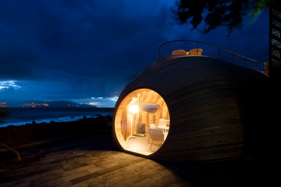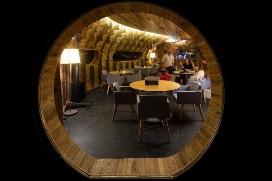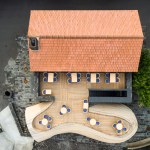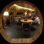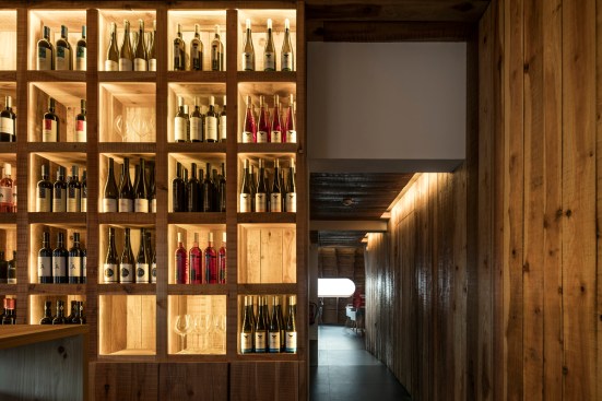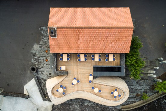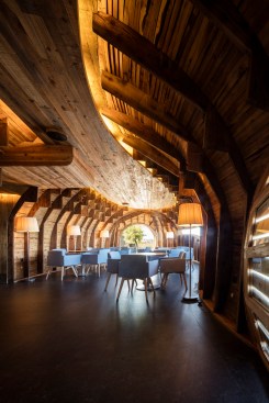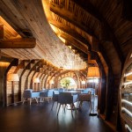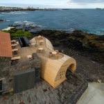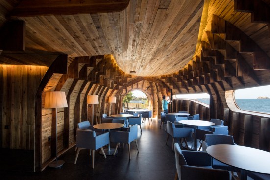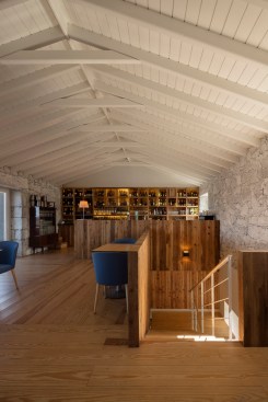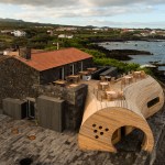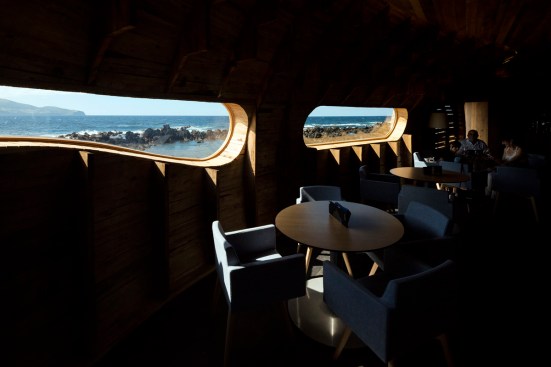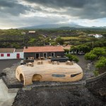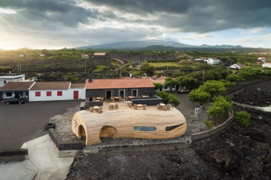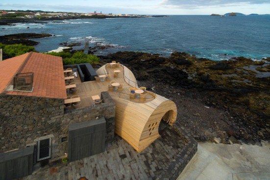 The building is the result of a regenerative transformation and expansion of a small pre-existing structure that had been abandoned for many years. The walls, roof and door frames have been restored, preserving the essential features of the original construction. The interiors were redesigned, shaped to their new roles (e.g. restaurant), and made compatible with current legal requirements. The new volume is a contemporary creation, exposed to a completely different language. It is an organic, dynamic construction that contrasts with the orthogonal, classical language of the building where it is embedded. The design is defined by great plasticity, both in terms of forms and materials, and is markedly inspired by the natural environment around the site. Several features of that environment are present in the architecture of the building, including the outline of the island, rocks, whales and wine casks. The new volume acts like a giant sculpture, tailored for its location.