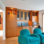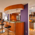 The Owners wanted to open this space visually to the dining and living areas while adding a island and improving the flow. To achieve this, space was borrowed from an adjoining area between the kitchen and dining room which widened the kitchen to allow for an island, and brought the view from the kitchen sink in line with the, now opened, wall expanding sight lines to the other rooms. A curved, raised, counter with stools became a place where guests congregate to chat while their hosts prepared food. This cylindrical form intersects a colorful rectangular wall. The large central island and hood provide a strong visual element from all vantage points.