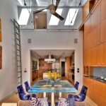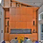 A room was added as a place for everyday dining. The vaulted ceiling with skylights, and exterior wall with sliding glass doors and clerestory windows provide the kitchen with light and a view to the outdoors. A rolling “library” ladder gives access to a wall of storage cabinets and shelving. A new cantilevered deck is accessible from this room. The guardrail of stainless steel cable and shaped wood cap play upon the materials used within the house.