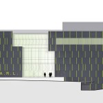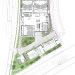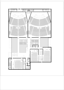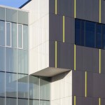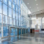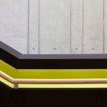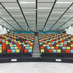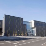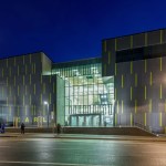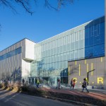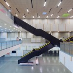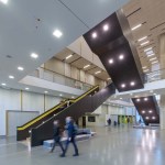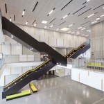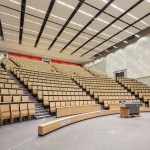 The four storey lecture hall centre is conceived as a singular sculptural object, breaking with the city block structure by pulling back from the adjacent line of buildings and creating a plaza and green urban space surrounding it. The compact building comprises two solid masses united by an airy, transparent atrium cutting through the building in a ziggurat pattern. The large atrium integrates several informal spaces of various sizes to form squares and terraces for social activity and knowledge sharing.