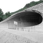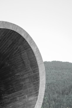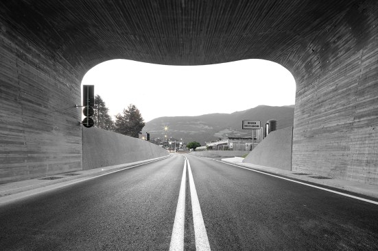 The newly opened central juncture tract of the ring road is the section of the project that reconnects with the main thoroughfare of the SS12 in proximity to Bressanone city centre. Travelling from the ring road, motorists navigate a roundabout and pass through a short U-shaped tunnel along with its two, respective exposed concrete portals to arrive at a shifted axis with Via Roma – the main road leading directly into town. The sculptural mouth of the new portal facing east takes a sinuous form that contributes to the lexicon of curvilinear elements that characterize many of the design interventions of the original project, steering away from the strictly technical or functional vocabulary typically offered by infrastructural projects.