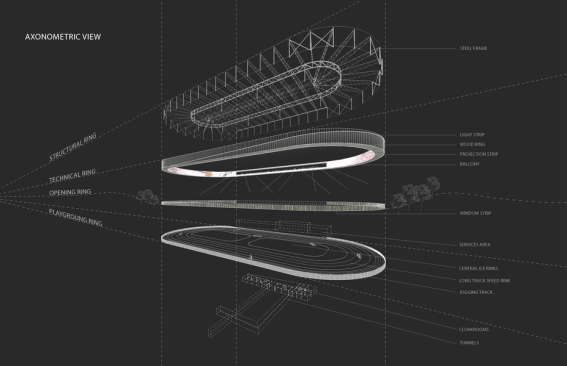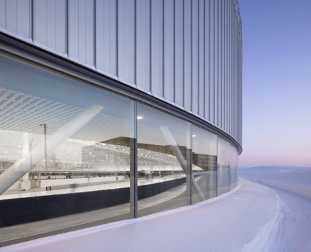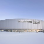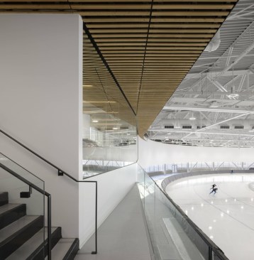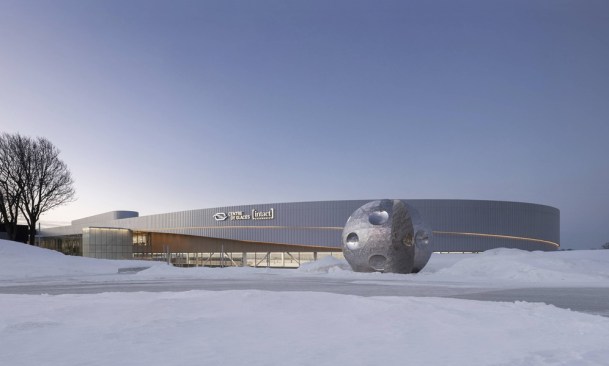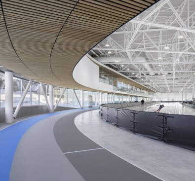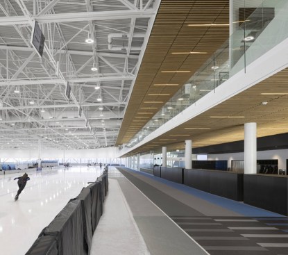 The building’s design reflects the landscape with a metallic skin that mimics the appearance of ice. Its oval shape symbolizes the speed and fluidity of skaters. The Centre gradually reveals itself to motorists on the nearby highway, echoing their acceleration as pedestrians move alongside the building. The structure’s openness fosters a community gathering place where ice skating is accessible to everyone, from Olympic athletes to beginners and families.