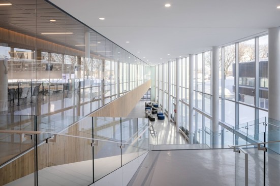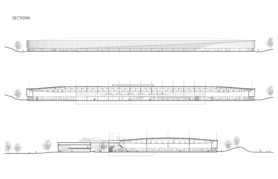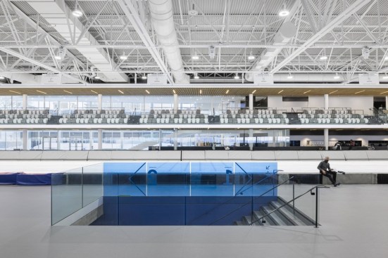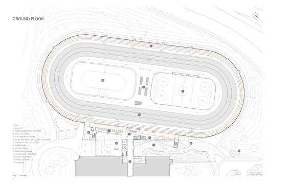 Designers created a strong yet minimalist brand for the Centre, ensuring that its graphical elements are easily recognizable to both locals and international visitors. This branding supports intuitive wayfinding and orientation throughout the facility. The Centre de glaces de Québec provides a space where skaters of all levels can enjoy their sports within a natural landscape, protected by a delicately suspended ring.