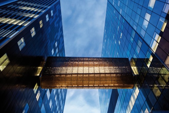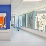Despite its large size, CHUM has a very human scale, through its massing as a community of three interconnected towers that retain individual identities while communicating and relating to each other. The architectural design combines historic architectural artifacts, such as the Eglise Saint Sauveur steeple, with a nuanced expression of cladding materials, creating a juxtaposition that redefines the identity of the district around the site. Viewed as a cultural center just as much as a destination for health, art is infused throughout the development — from the expressive form that houses the auditorium in the entry garden to the monumental works of art that aid in wayfinding and encourage moments of contemplation and stillness.