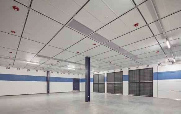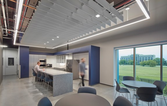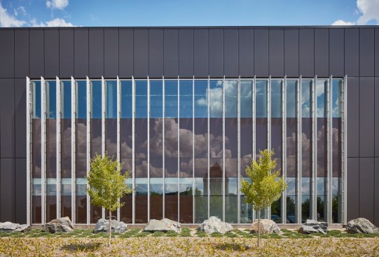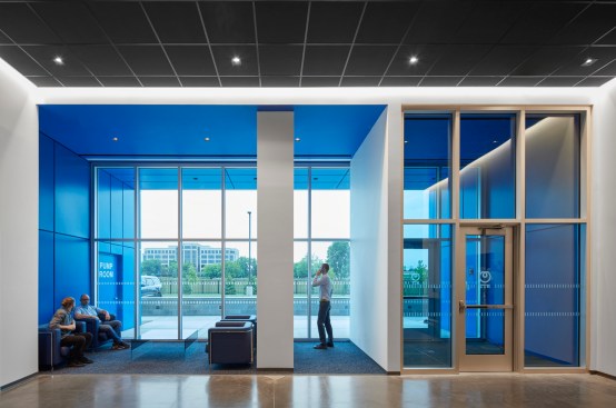 The project lies within a prominent location in a corporate office park where this project would be the first data center, with architectural expectations higher than in other locales. The design team utilized contrasting textures, colors, and patterning to add visual interest to the facades where it mattered most and identified several design elements that could be transferrable to other buildings and locations to reinforce a sense of brand for NTT. These include the NTT blue frame around the main entrance and blue-tinted glass curtainwall, blue stripes between metal cladding colors on the stair towers, and patterning on concrete.